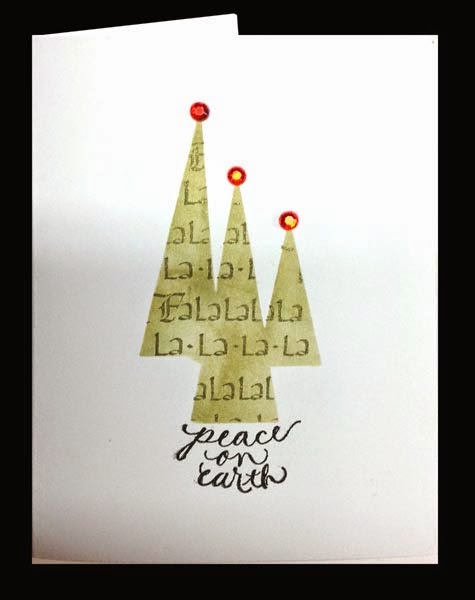 Cut some tall skinny type triangles in a piece of cardstock to create a stencil to represent my Xmas trees. Sponged Distress "Shabby Shutters" all over the trees through the stencil. Heat set the ink. Then stamped the "Fa La La..." portion of the Xmas quote stamp using repeatedly Versafine "Olympian Green" and embossed with Linda's Stamp Gang "Oak Leaf Olive" embossing powder. Added 3 red rhinestones on the tree tops.