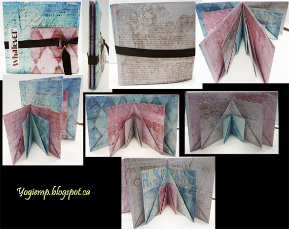 Our next challenge is to create a pocket type booklet as seen in Bound & Lettered (winter 2011 issue). It's a nice basic fold, but rather than have individual pocket pages, I decided to stack various size pockets into each other.